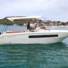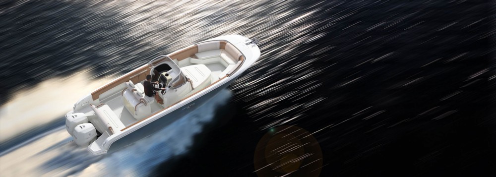 El primogénito de la serie FX está diseñado para los navegantes deportivos. Está equipado con motores fueraborda y su casco está diseñado para ofrecer un gran rendimiento con total seguridad, incluso con mar gruesa. Se trata de una embarcación que aúna acción y lujo, gracias a una refinada selección de colores, materiales y formas que crean un auténtico espacio de entretenimiento en el mar. Por estas razones, el FX270 ofrece tanto una versión «Ocio» como una «Pesca», gracias a su cubierta amplia y versátil. La proa alberga un pañol sorprendentemente grande, especialmente equipado para alojar alas y equipos deportivos y de seguridad. El espacio abierto, ideal para pescar, puede equiparse con un sofá adicional para crear una dinette. El timón, alto y bien protegido, está integrado con la consola y la estructura del parabrisas principal. Bajo cubierta, un vestuario con WC completa el equipamiento de esta embarcación, diseñada para quienes buscan un compañero de aventuras deportivo y elegante.
