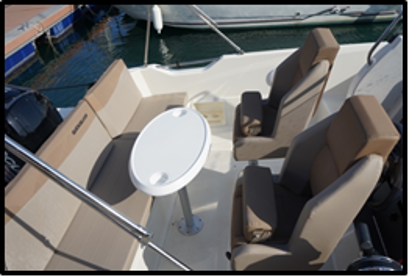 La espaciosa zona de proa se transforma en un amplio solárium en segundos. Después de disfrutar del sol, una mesa con porta bebidas integrado convierte el solárium en una zona dinette con capacidad para 4 adultos. En la popa, la bañera es el sitio perfecto para socializar gracias a los asientos pivotantes del piloto y copiloto. Para los amantes de los deportes acuáticos, el mástil de esquí está disponible para su instalación instantánea.