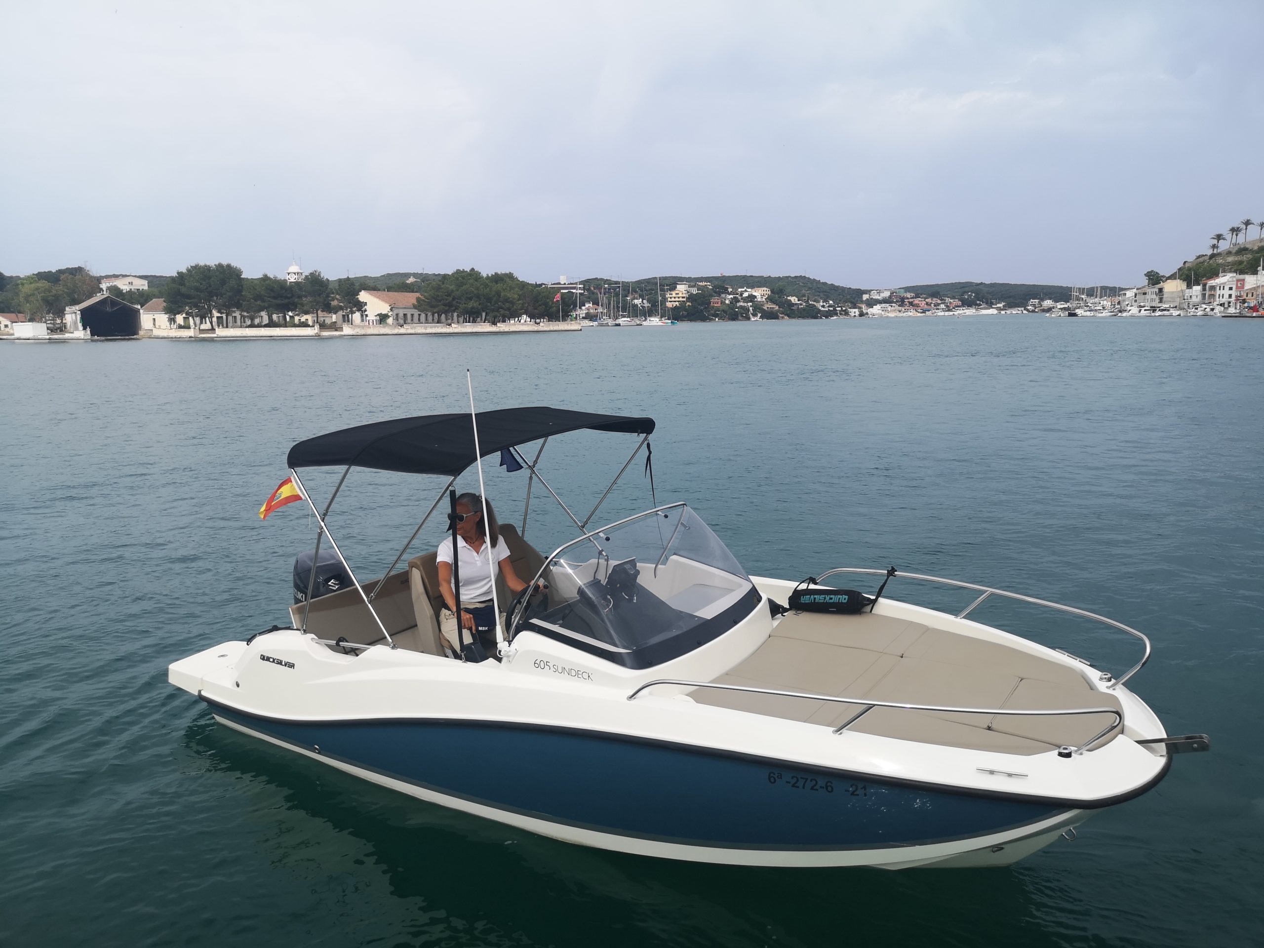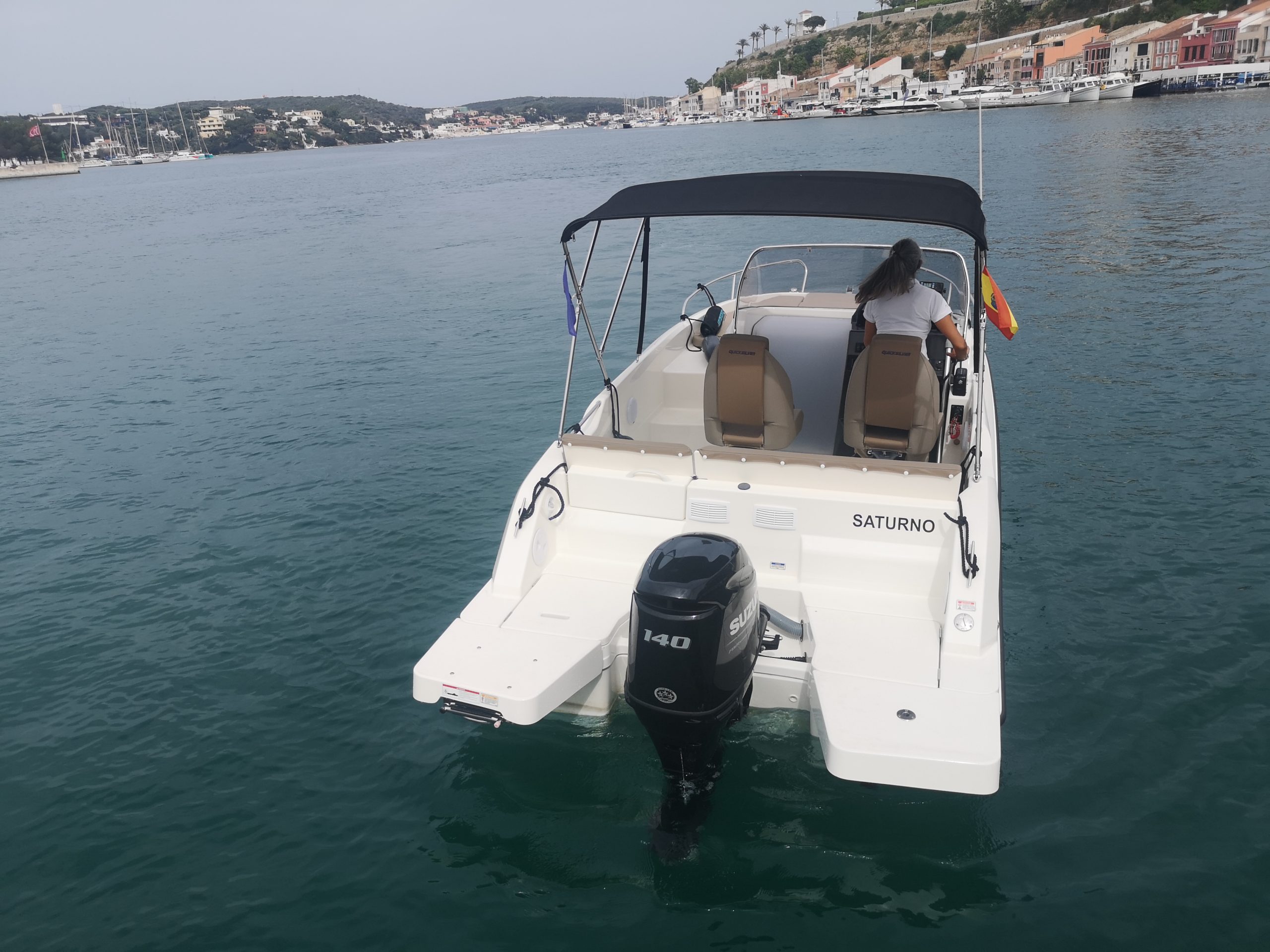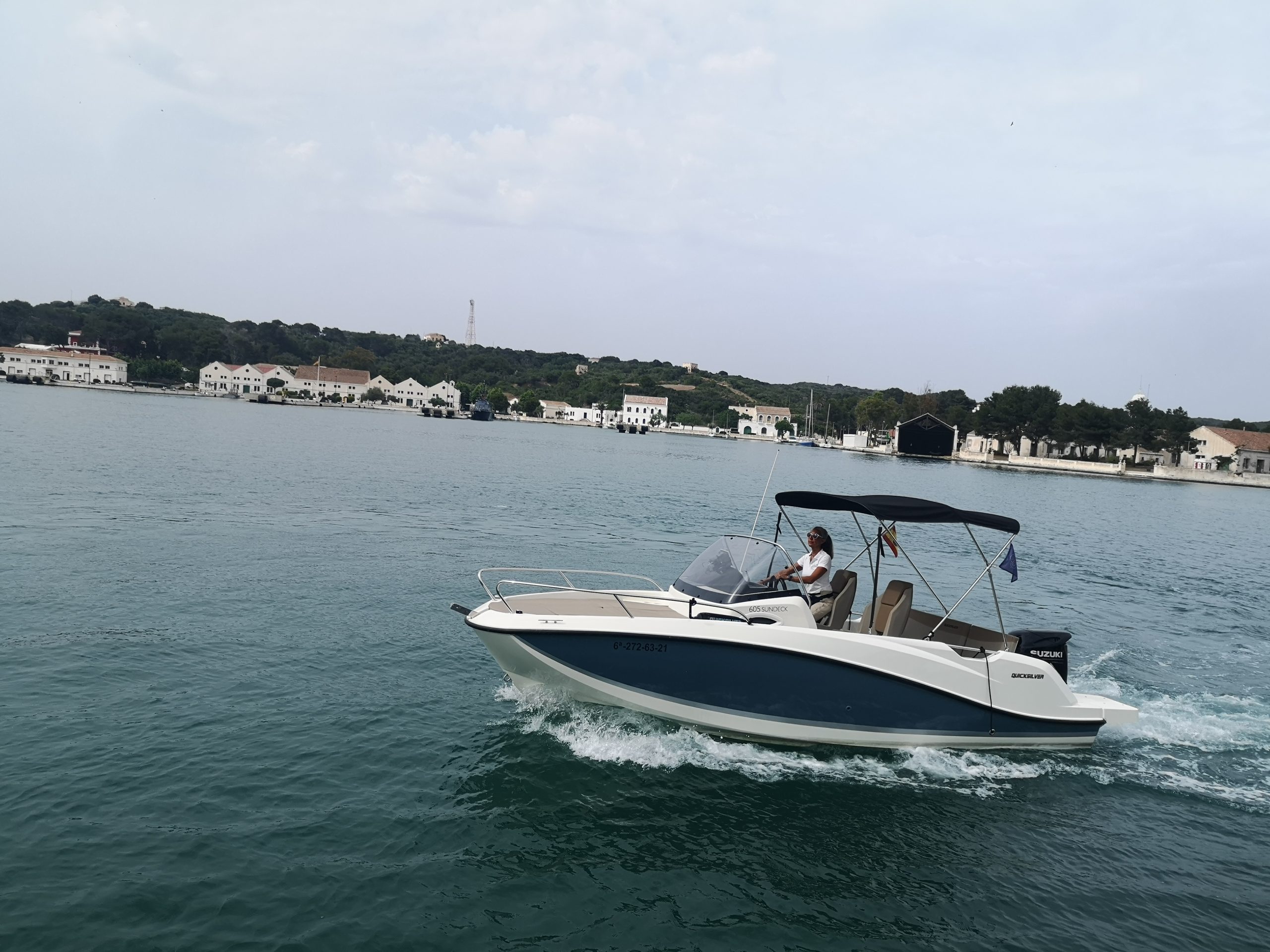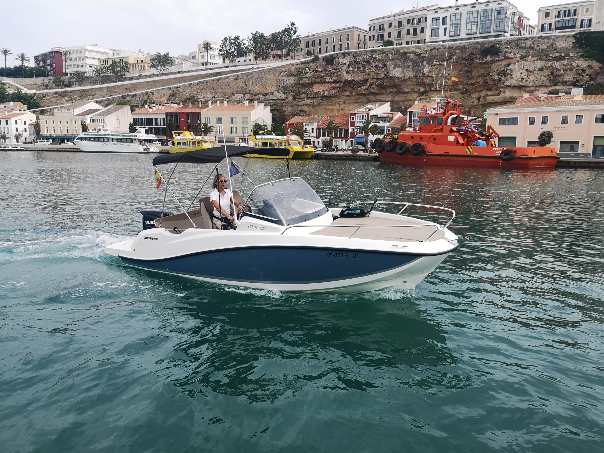 Quicksilver 605 Sundeck tiene un motor Suzuki con 140 cv y eslora de 6 metros. Si tienes el “titulín” o la Licencia básica de Navegación, puedes navegar con esta embarcación. El diseño de este barco sorprende a todo el que la prueba por su gran comodidad y ergonomía, y es que la accesibilidad es total gracias a los anchos escalones de popa, los pasamanos bien situados y el alto francobordo. Además, en la popa encontrarás una escalera escondida para que el acceso al mar o a la embarcación no te resulte complicado y mucho espacio de almacenaje para todos tus accesorios. En popa dispone de un sofá y dos asientos giratorios para que encuentres la máxima comodidad en cada momento, y en proa un amplio solárium para disfrutar del sol en los días de verano, aunque si no es de tu agrado, no hay problema, tienes a tu disposición un toldo Bimini para disfrutar también de la agradable sombra. El respaldo pivotante facilita el acceso a la plataforma de baño y con escaleras integradas en la plataforma te ayudarán con la entrada y la salida del agua. El solárium de 2 metros ofrecen espacio para 7 personas que disfrutarán a tope del sol y si no eres muy amigo del sol puedes refugiarte gracias a la cabina con una puerta corredera te permite un acceso fácil a la zona de cabina con espacio para sentarte y por la noche se convierte en una cama doble. La bañera es la zona más versátil ya que el respaldo reclinable del asiento de popa permite el acceso a la plataforma de baño. Los asientos giratorios del piloto y copiloto convierten la zona de la bañera en una zona dinette para 4. El espacio de estiba bajo los asientos de popa, en la cabina, y en la bandeja del puesto de gobierno significa que existe espacio específico para tu equipo (colchonetas, mesa exterior, mástil de esquí, luces de navegación, salvavidas, etc.) y para otros artículos más pequeños y efectos personales.