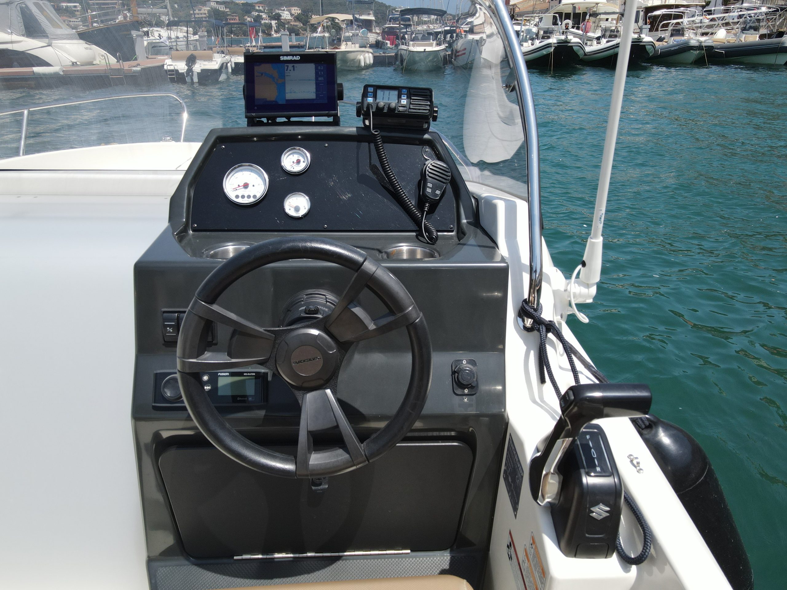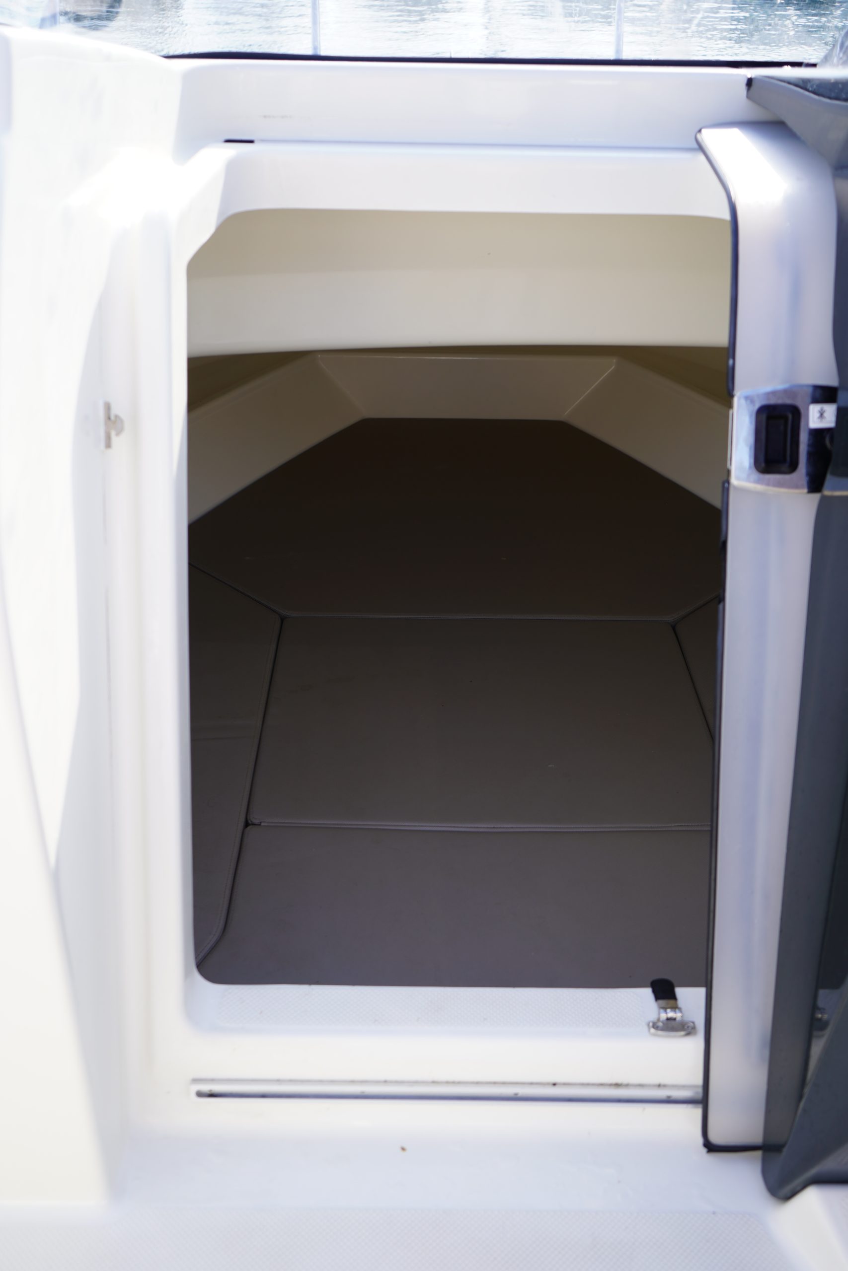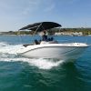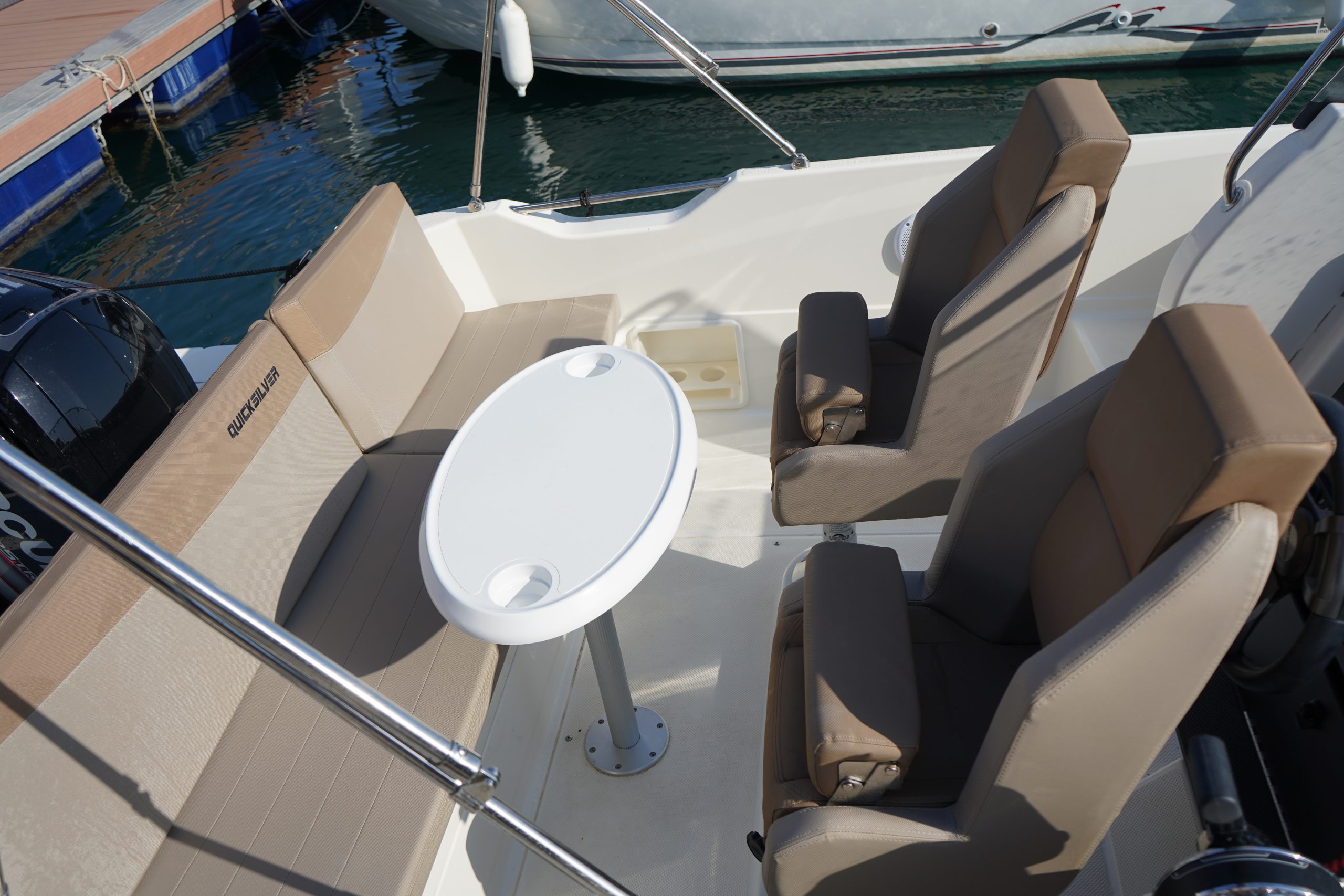 Quicksilver 605 Sundeck tiene un motor Suzuki con 140 cv y eslora de 6 metros. Si tienes el “titulín” o la Licencia básica de Navegación, puedes navegar con esta embarcación. El diseño de este barco sorprende a todo el que la prueba por su gran comodidad y ergonomía, y es que la accesibilidad es total gracias a los anchos escalones de popa, los pasamanos bien situados y el alto francobordo. Además, en la popa encontrarás una escalera escondida para que el acceso al mar o a la embarcación no te resulte complicado y mucho espacio de almacenaje para todos tus accesorios. En popa dispone de un sofá y dos asientos giratorios para que encuentres la máxima comodidad en cada momento, y en proa un amplio solárium para disfrutar del sol en los días de verano, aunque si no es de tu agrado, no hay problema, tienes a tu disposición un toldo Bimini para disfrutar también de la agradable sombra. El respaldo pivotante facilita el acceso a la plataforma de baño y con escaleras integradas en la plataforma te ayudarán con la entrada y la salida del agua. El solárium de 2 metros ofrecen espacio para 7 personas que disfrutarán a tope del sol y si no eres muy amigo del sol puedes refugiarte gracias a la cabina con una puerta corredera te permite un acceso fácil a la zona de cabina con espacio para sentarte y por la noche se convierte en una cama doble. La bañera es la zona más versátil ya que el respaldo reclinable del asiento de popa permite el acceso a la plataforma de baño. Los asientos giratorios del piloto y copiloto convierten la zona de la bañera en una zona dinette para 4. El espacio de estiba bajo los asientos de popa, en la cabina, y en la bandeja del puesto de gobierno significa que existe espacio específico para tu equipo (colchonetas, mesa exterior, mástil de esquí, luces de navegación, salvavidas, etc.) y para otros artículos más pequeños y efectos personales.